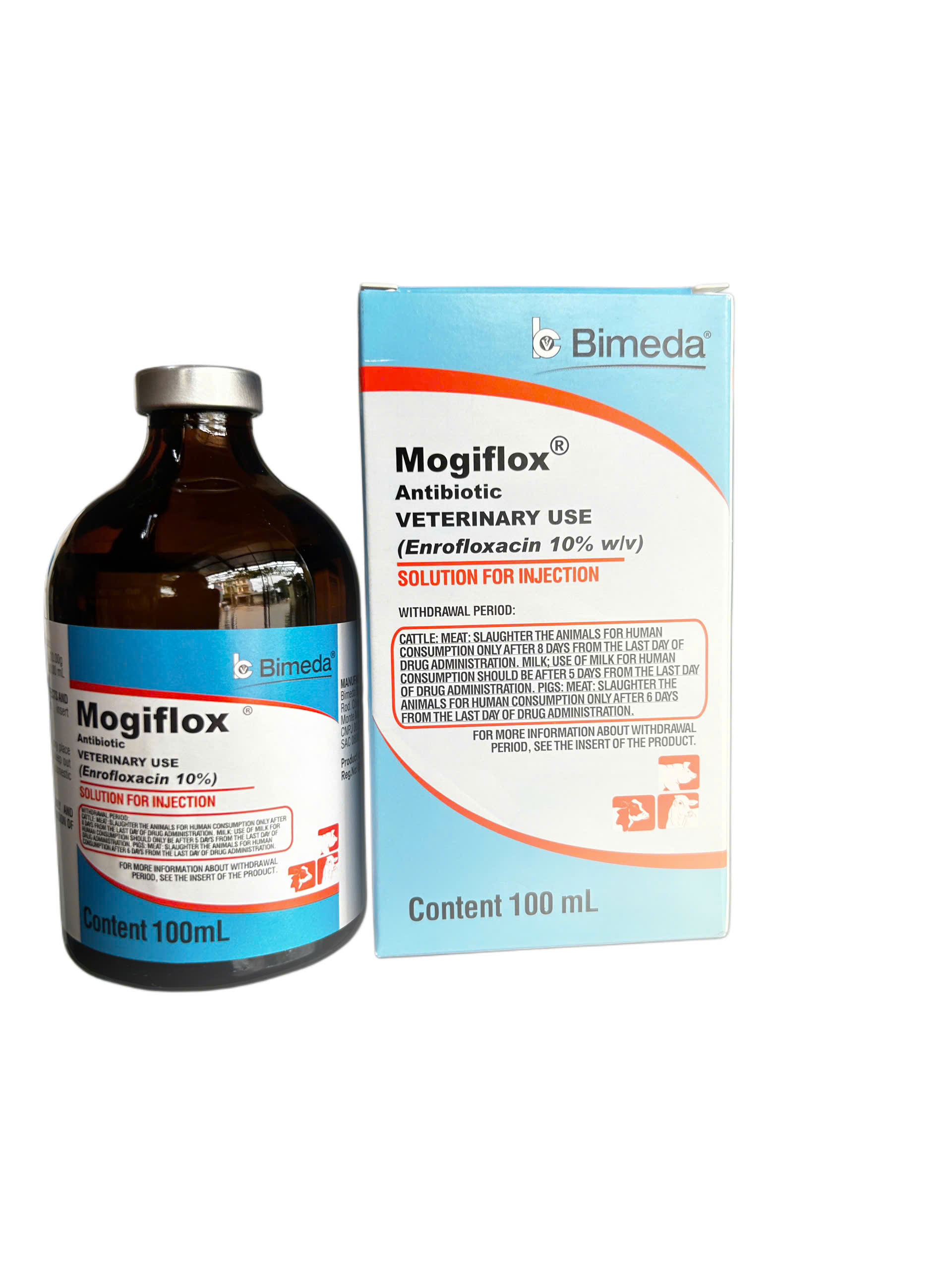 Gia súc và heo: Tiêm 1 ml Mogiflox cho 40kg (2,5mg / kg) trọng lượng cơ thể, hàng ngày trong 3 đến 5 ngày. Trong trường hợp nhiễm trùng đường hô hấp phức tạp, tiêm 1 ml thuốc tiêm Mogfilox cho 20kg (5mg / kg) thể trọng dùng trong 5 ngày.